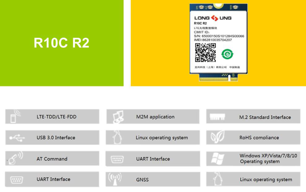 The R10C R2 is a new generation of Longsung LTE wireless module, supports LTE CAT6 up to 300Mbps data transfer , rich of Internet protocols, and industry-standard interfaces and abundant functionalities. It is Multi-Band LTE-FDD/LTE-TDD/HSPA+ module solution in a M.2 type.